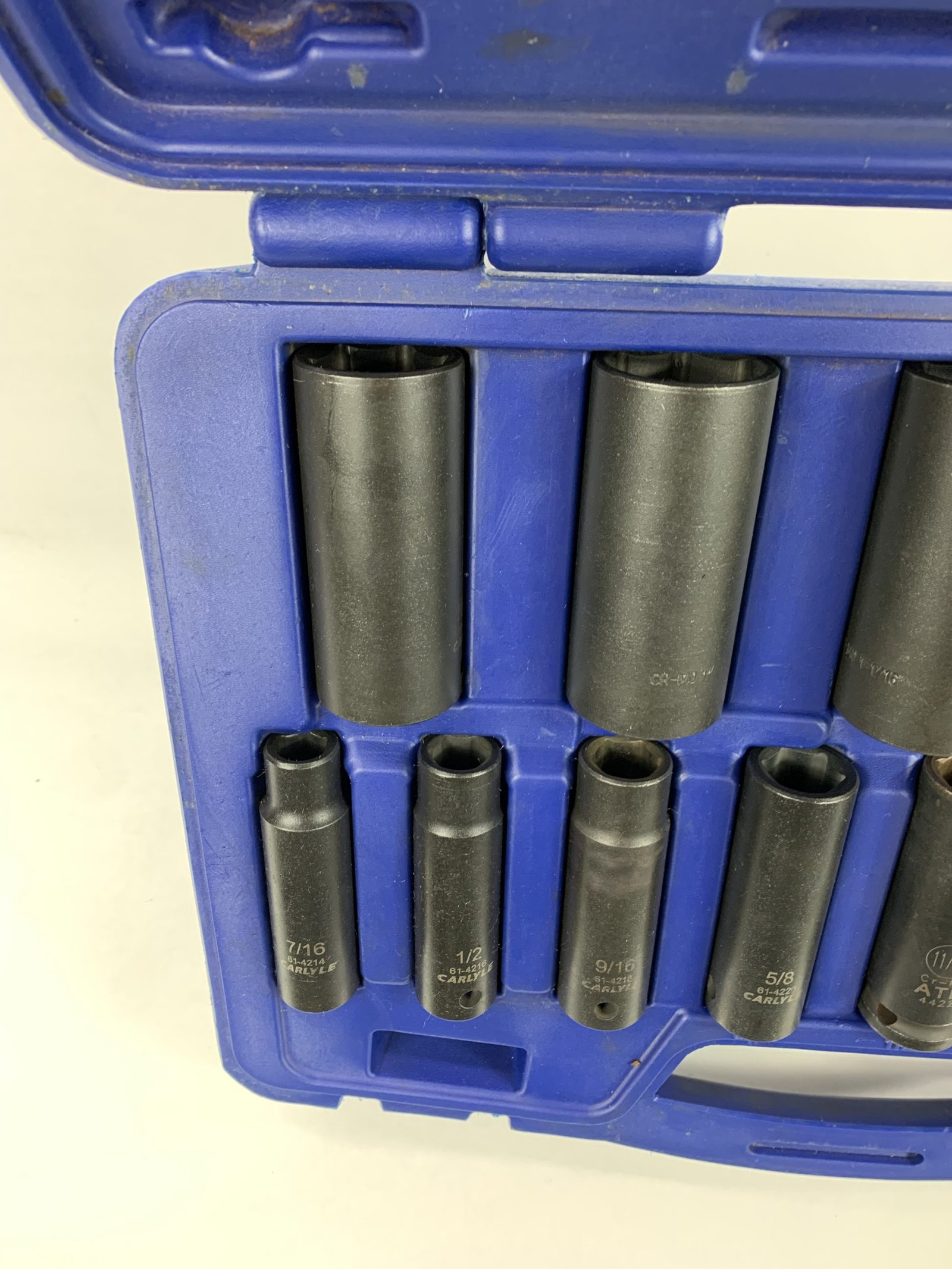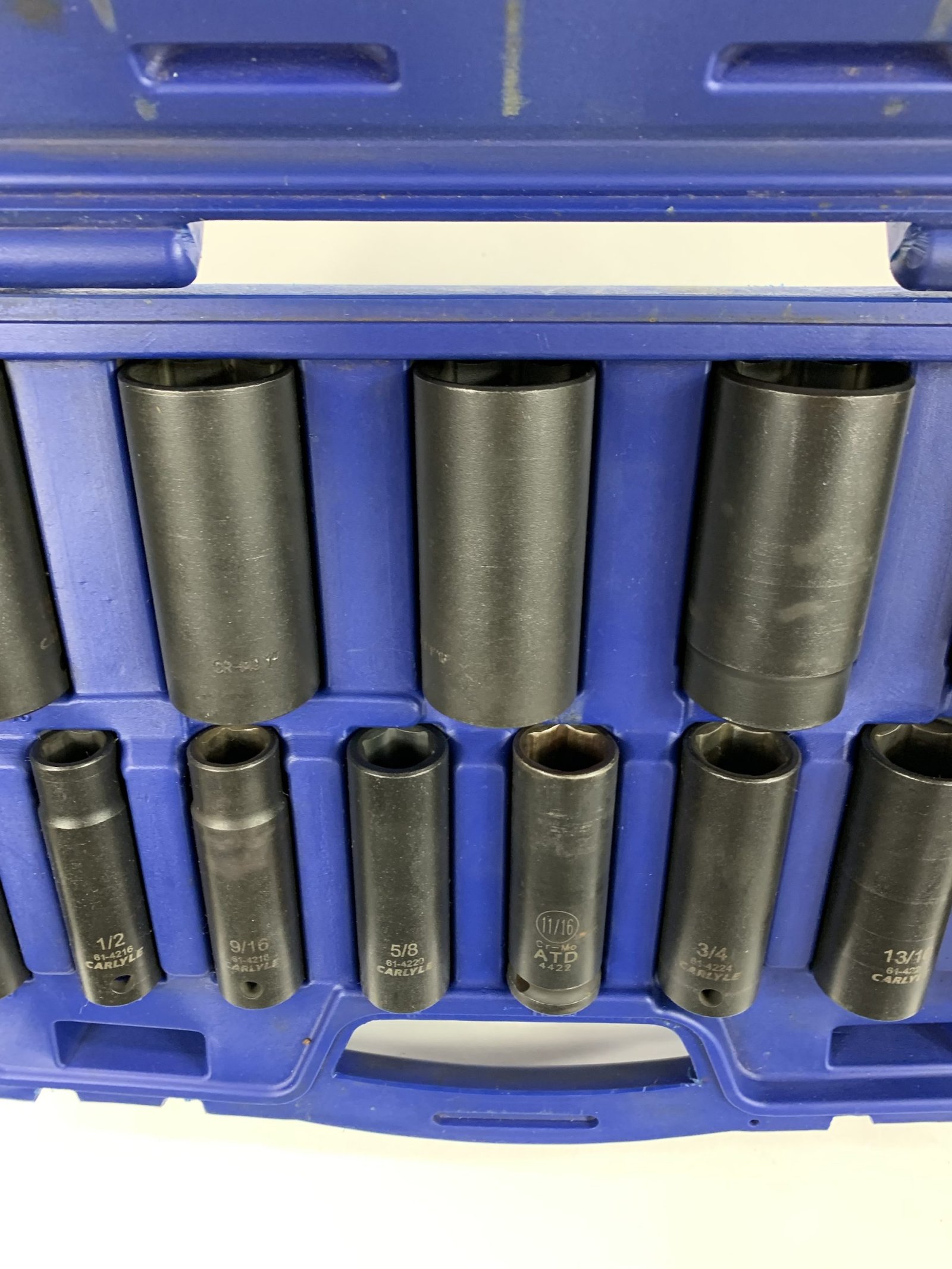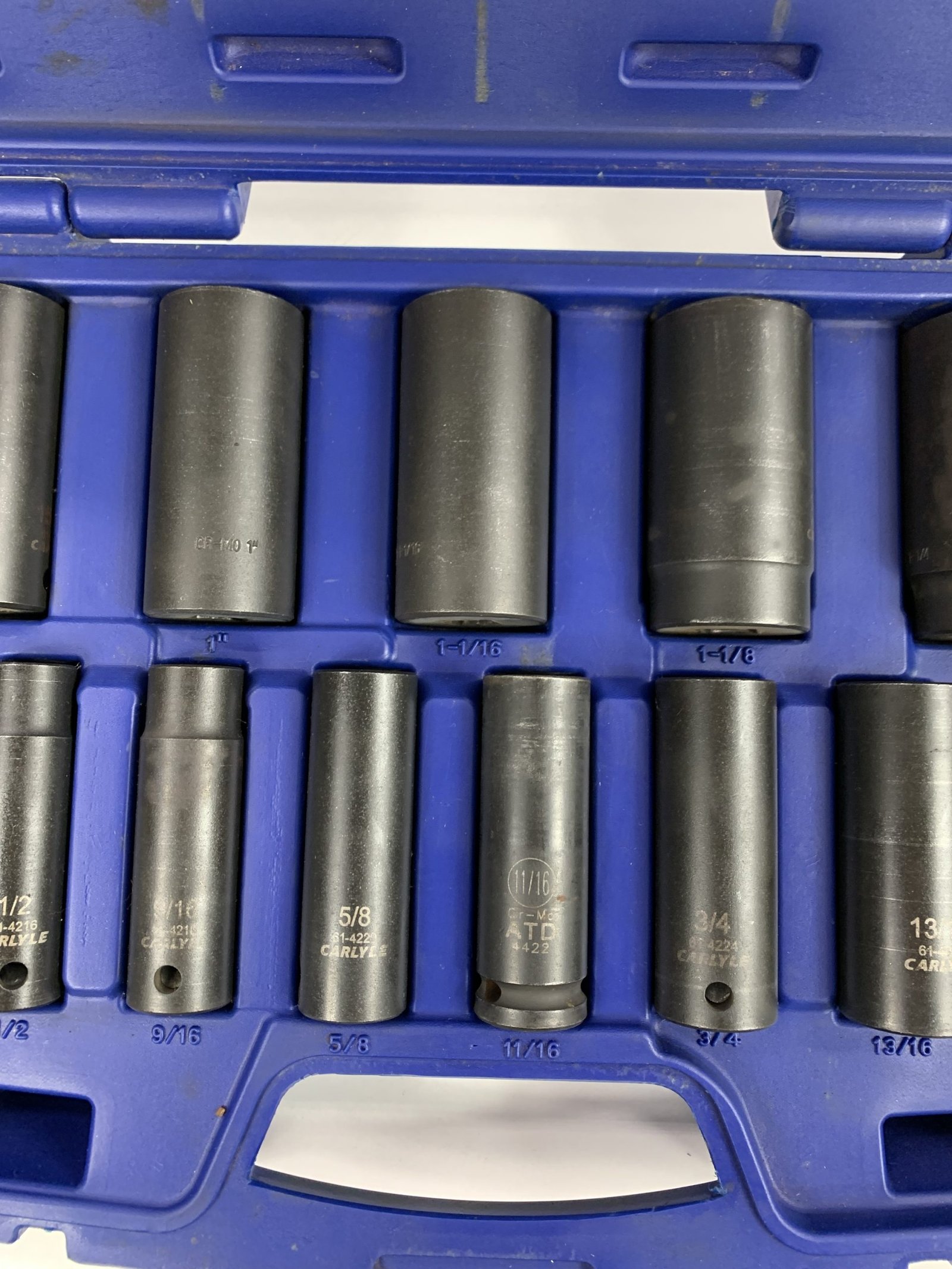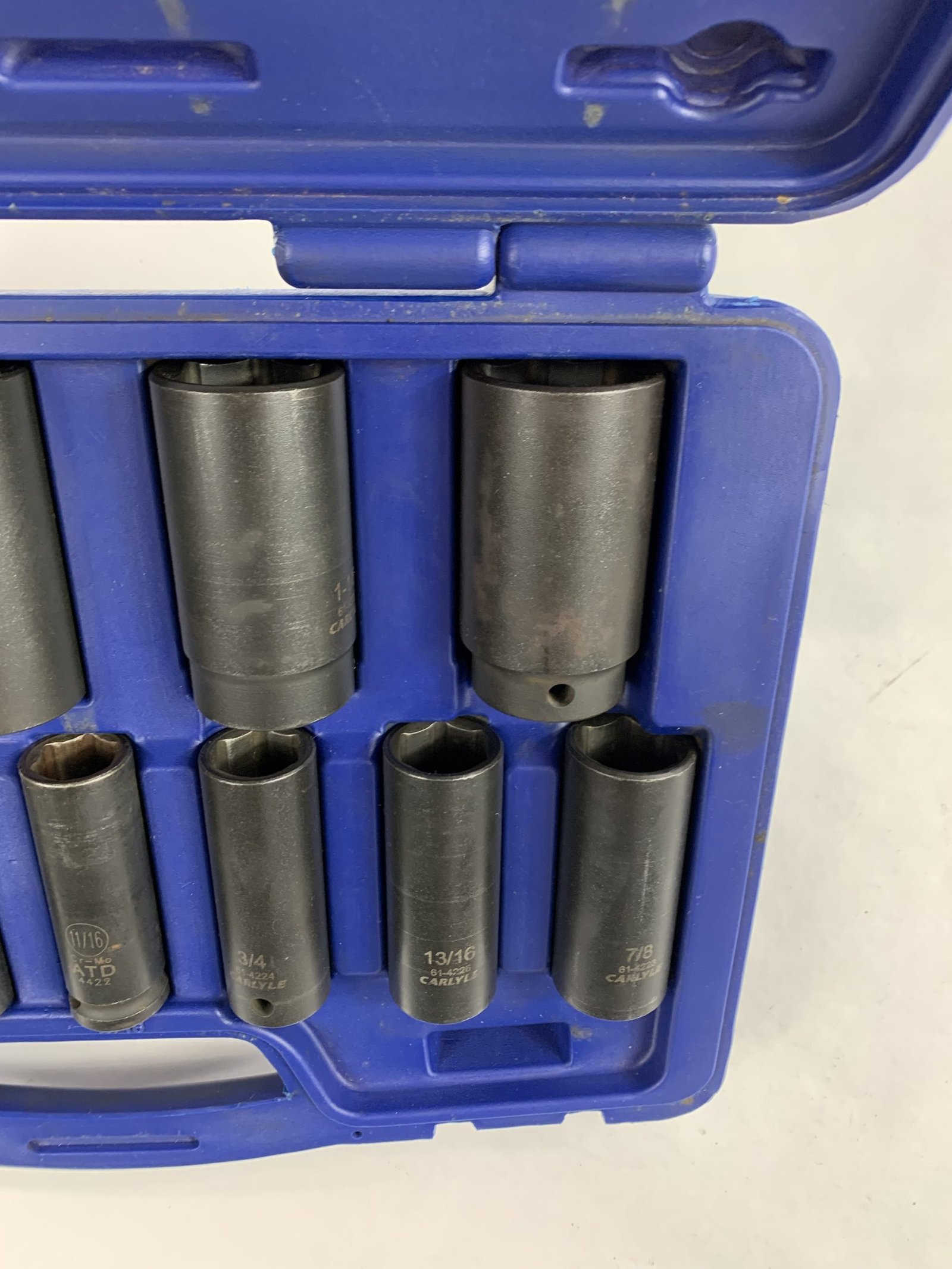 13 Piece 1/2″ Drive SAE Socket Set (1/16″ – 1-1/4″), 11/16 is ATD, Case has a Broken Latch, Used – Very Good