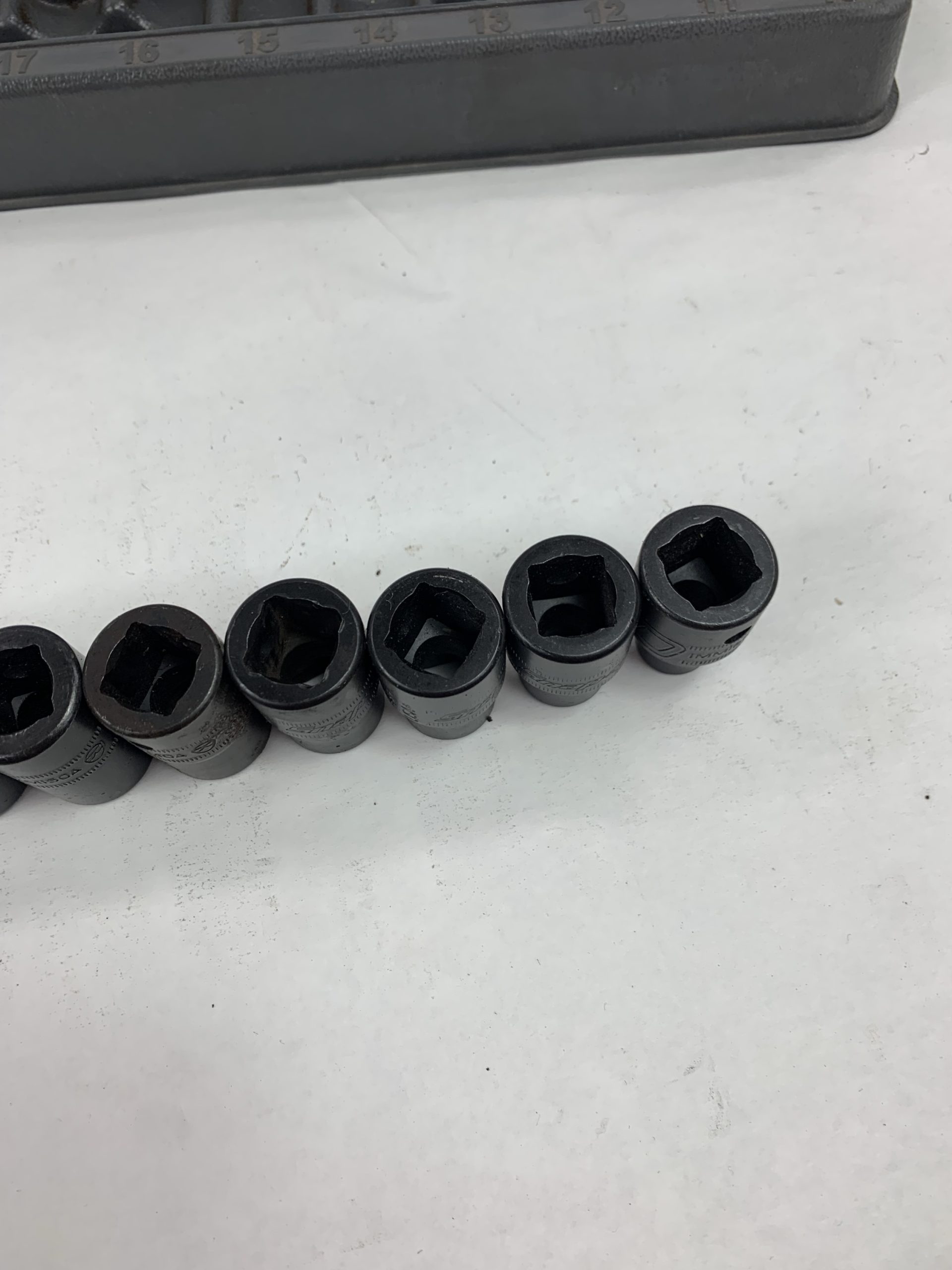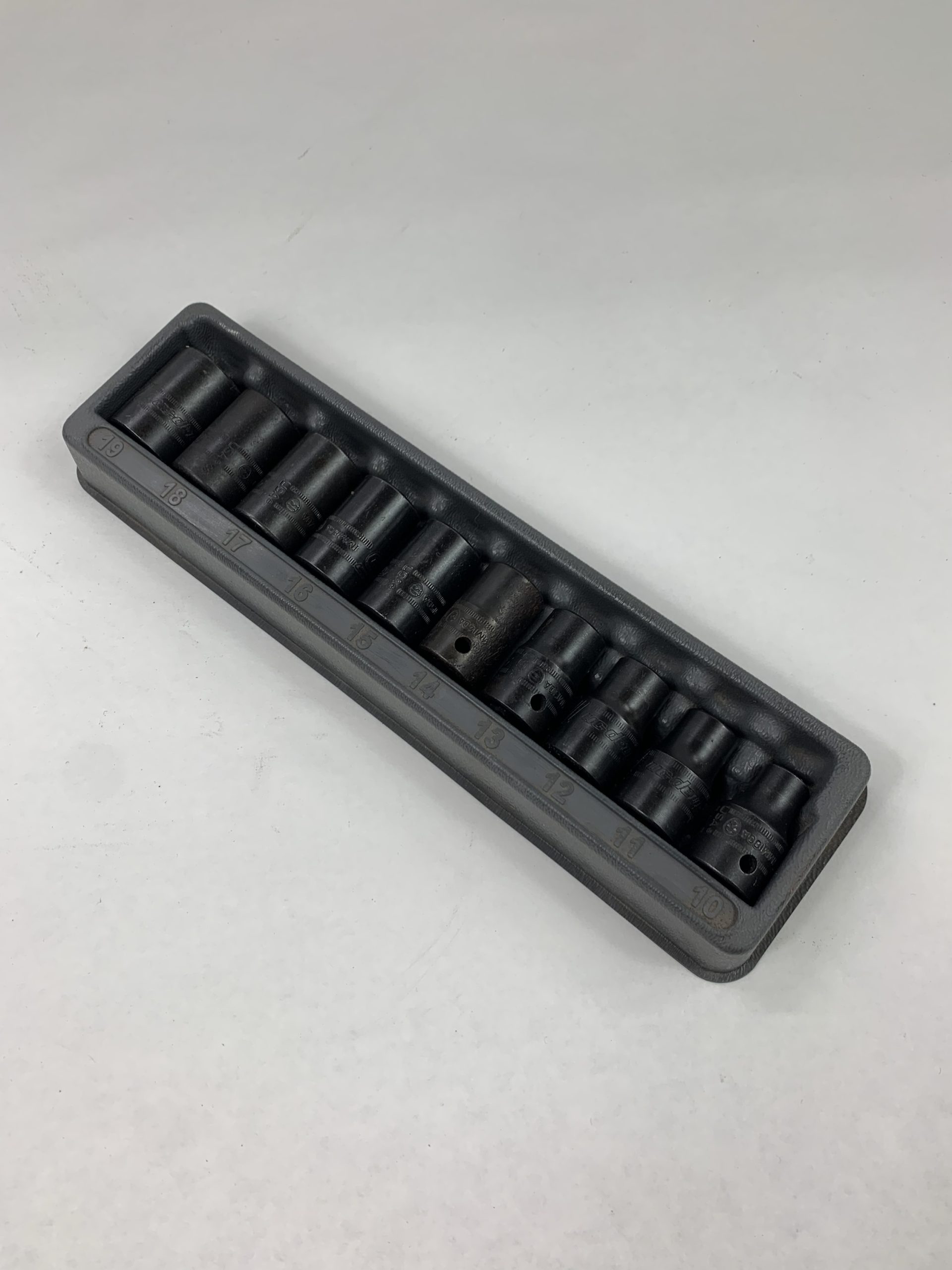 10 pc 1/2″ Drive 6-Point Metric Flank Drive® Shallow Impact Socket Set (10-19 mm), With Tray (Has Paint Overspray), Used – Good