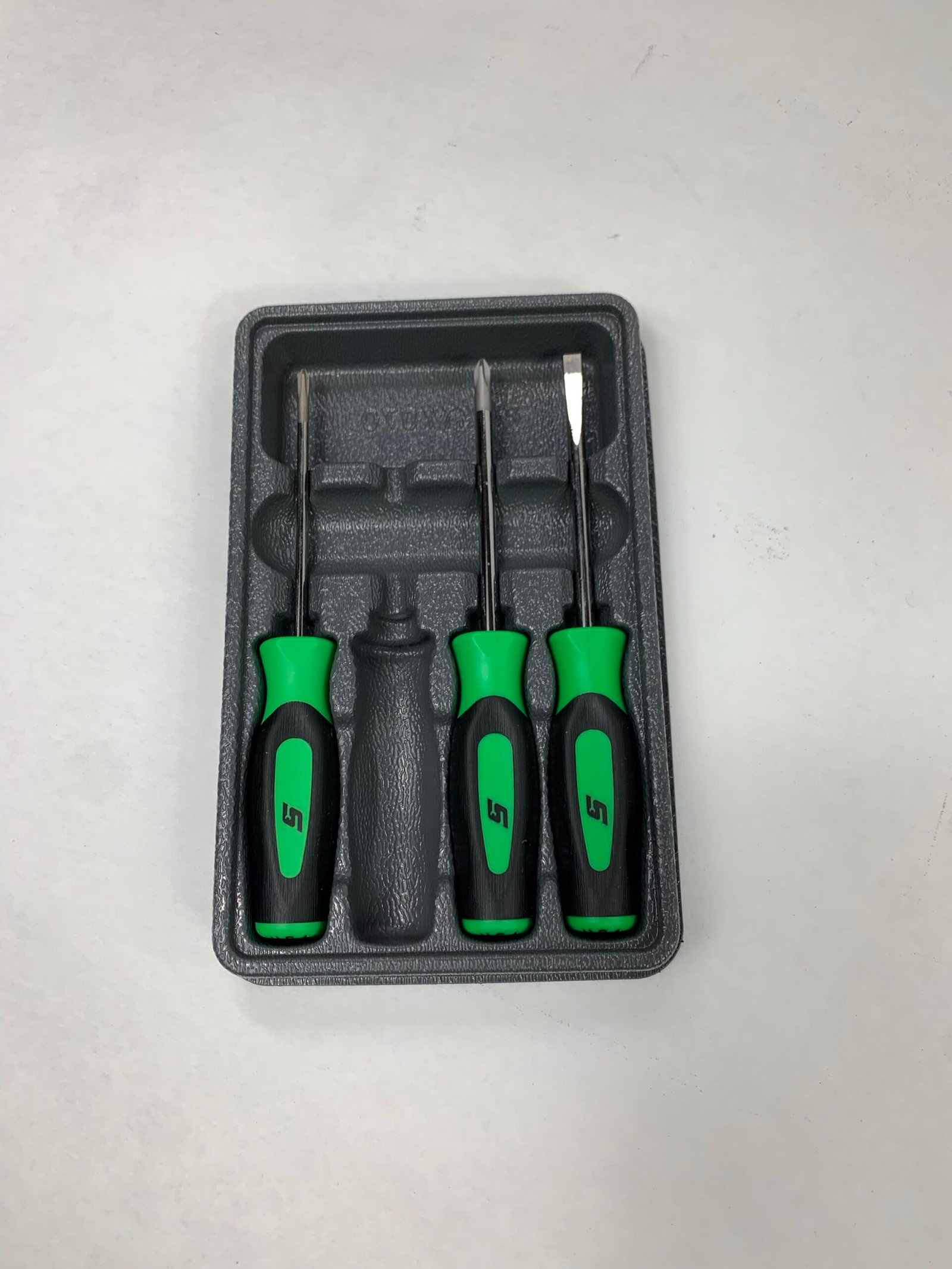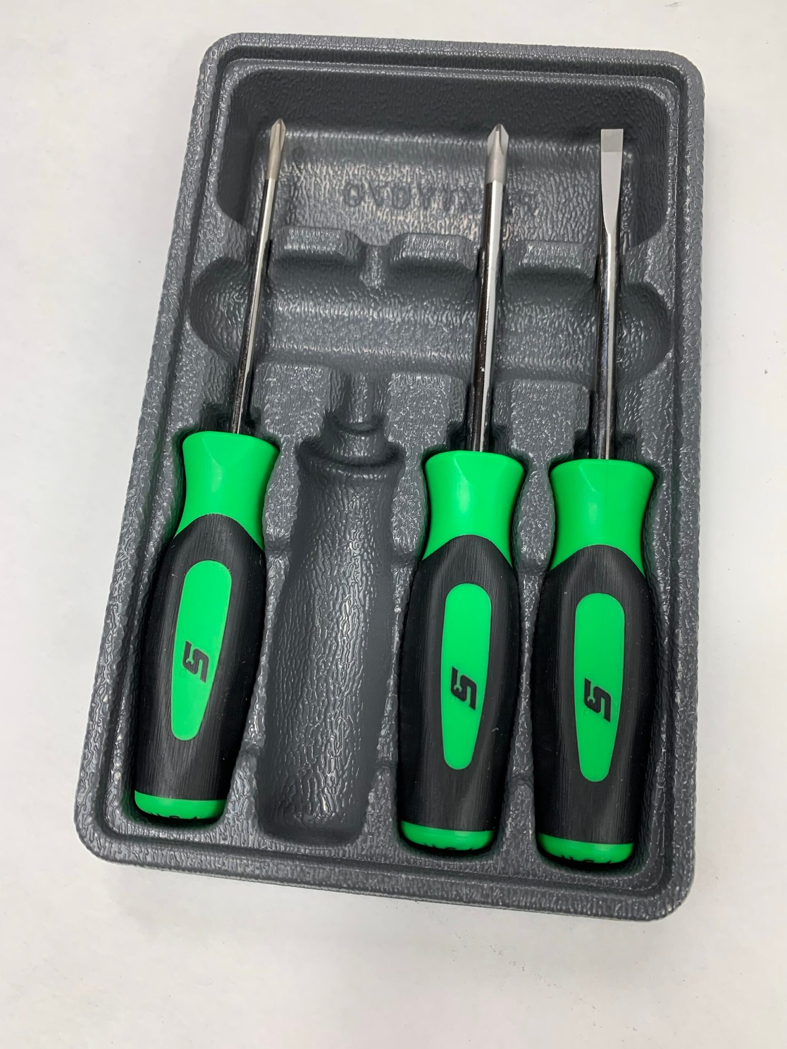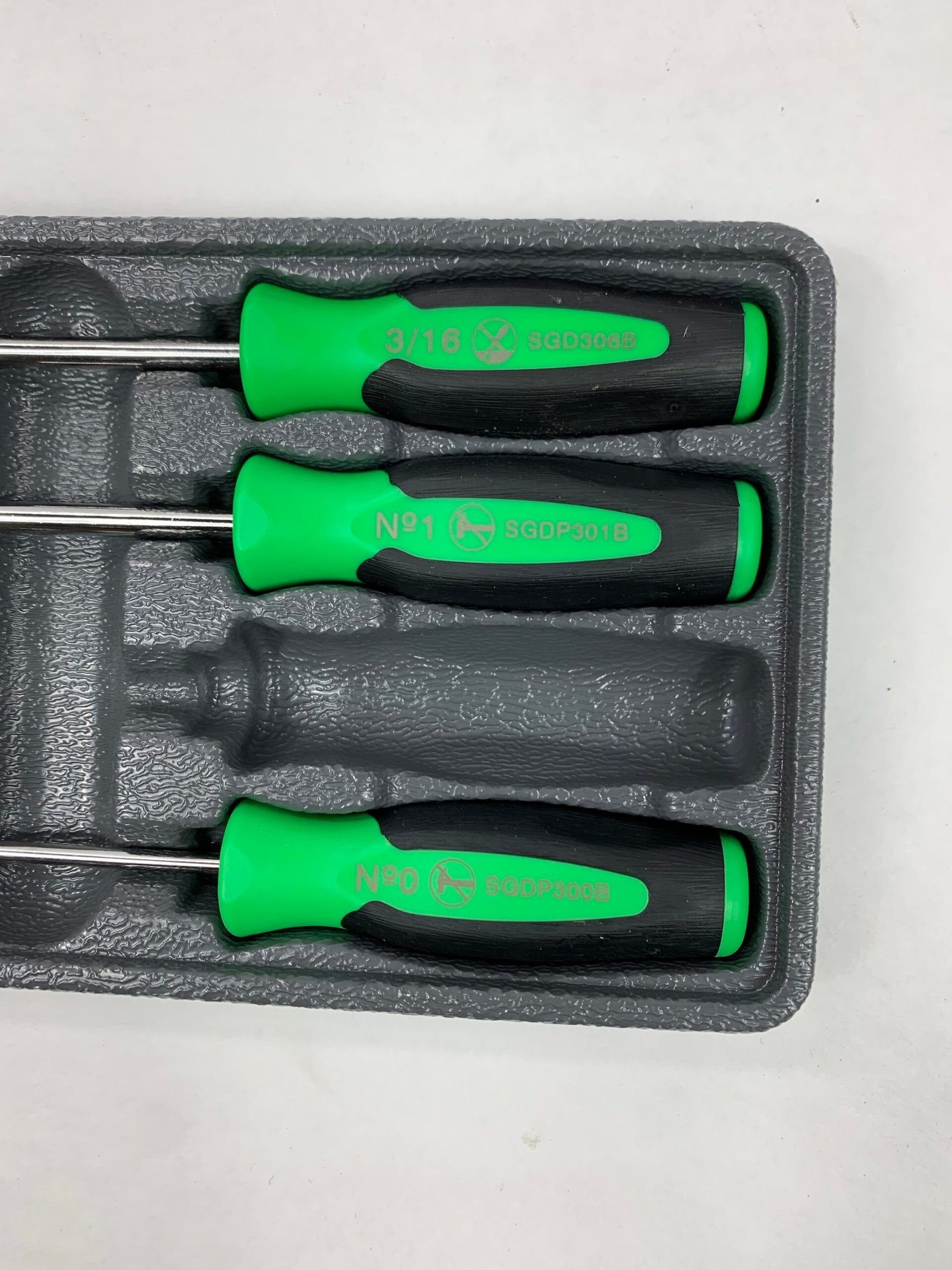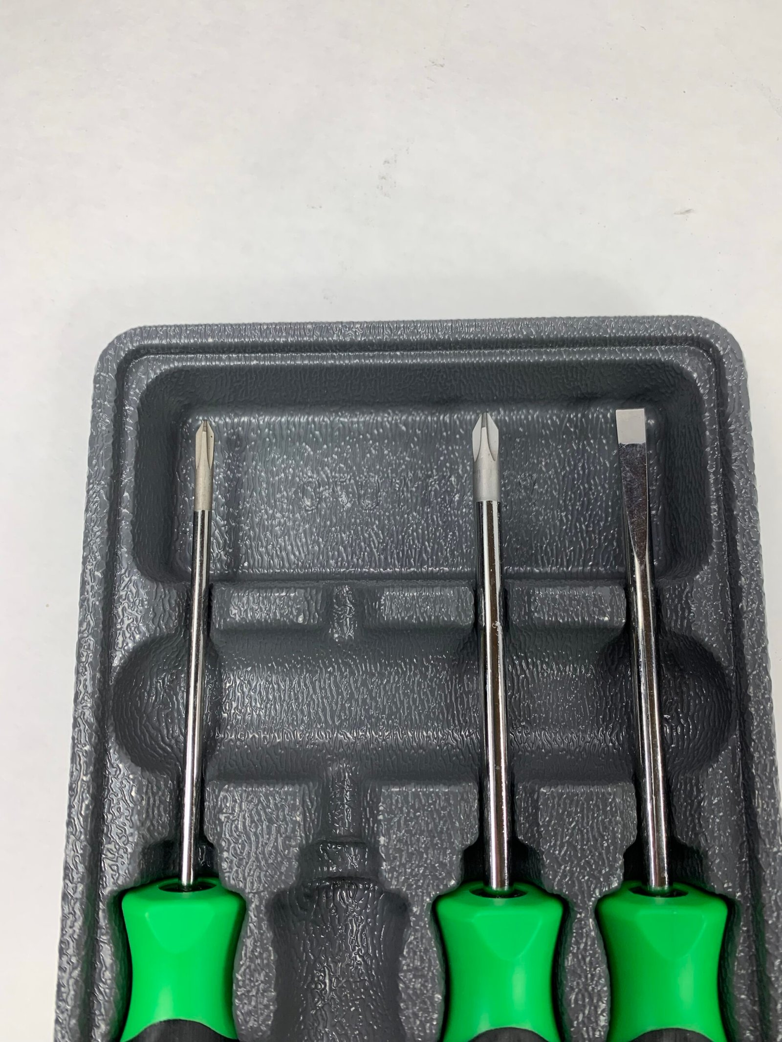 4 pc Instinct® Soft Grip Mini-Tip Combination Screwdriver Set, Missing 1 Piece – Smaller 1/8″ Flat Tip (SGD304BG), With Tray, Used – Very Good