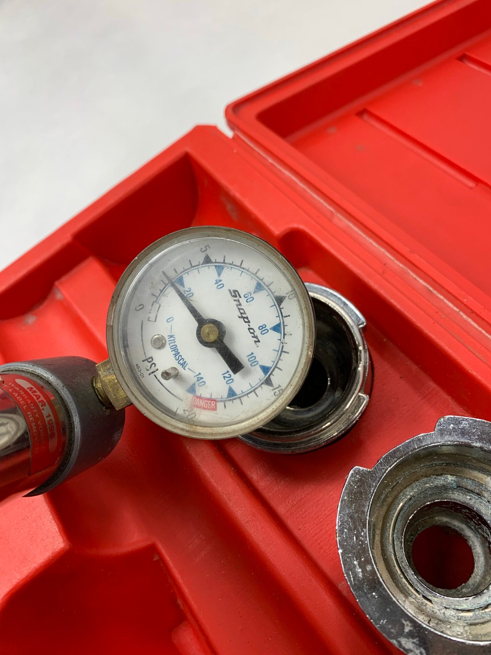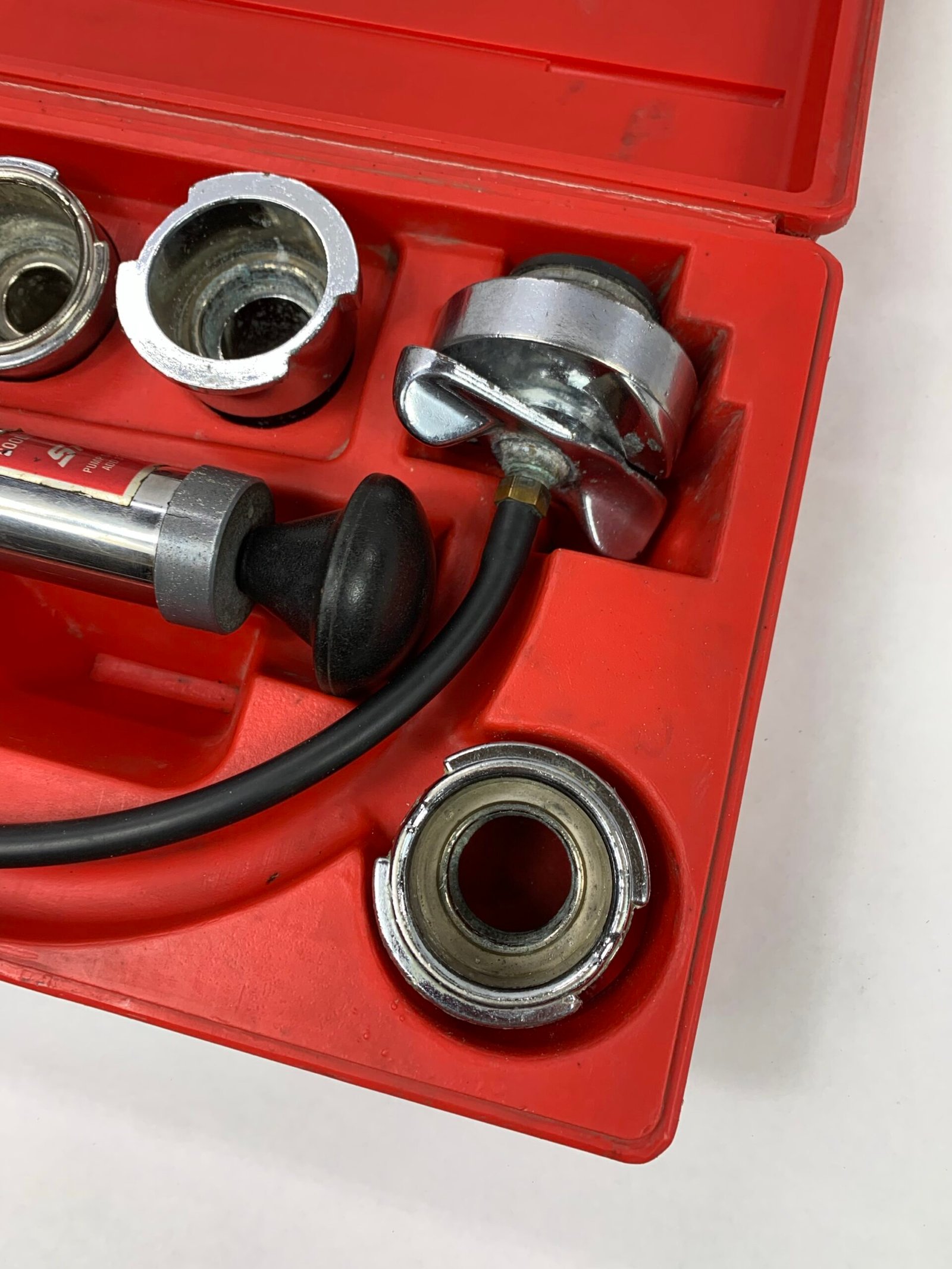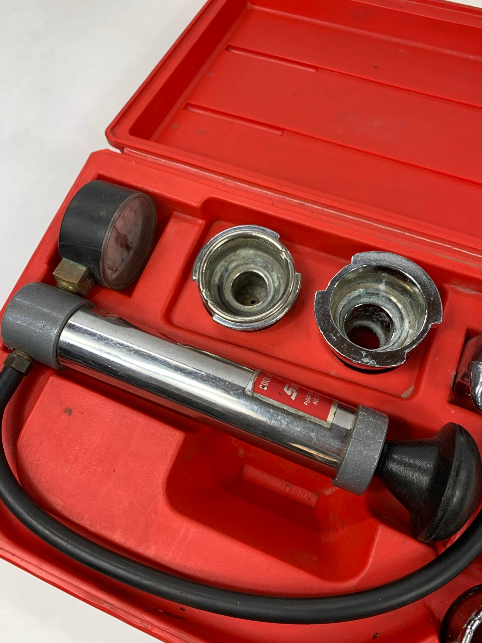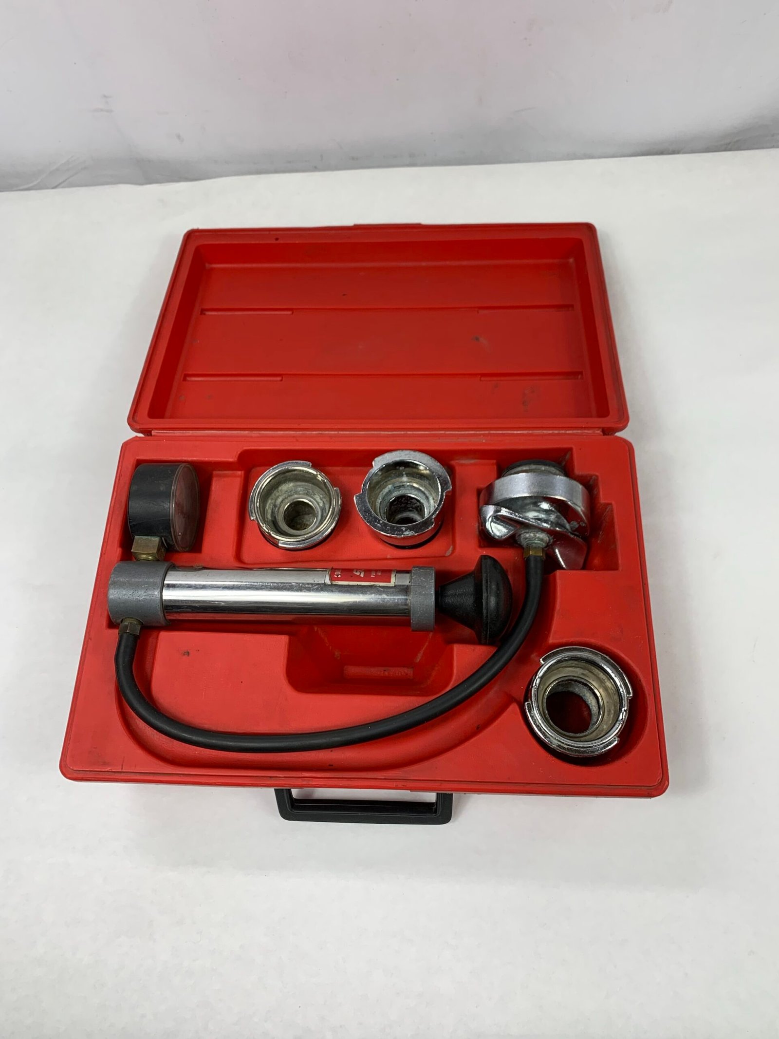 Cooling System Pressure Tester Kit, Some Corrosion on Adaptors, Case Latch Broken, Used – Good