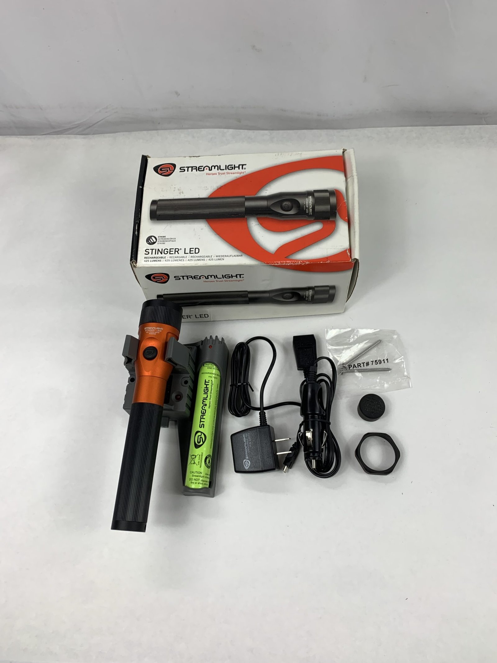 Rechargeable LED Flashlight, With Box, Charger and Extra Battery, Orange, Used – Very Good